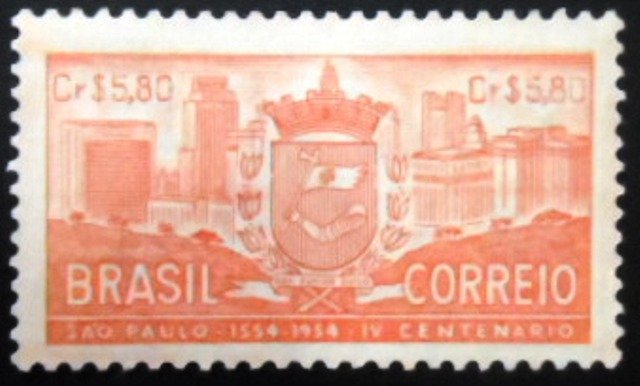 Selo postal Comemorativo NÃO CIRCULADO Emissão: 25.01.1954 Perfuração: 11½ x 11 Impressão: Fotogravura Valor facial: Cr$ 5,80 Impresso em PAPEL BRANCO Catálogo: RHM C 332 A