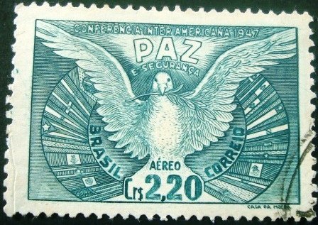 Selo postal Correio Aéreo CIRCULADO Emissão 15.08.1947 Catálogo RHM A 61 / Mi: BR 716 Perfuração 12 x 11 Impressão Recesso Valor facial Cr$ 2,20