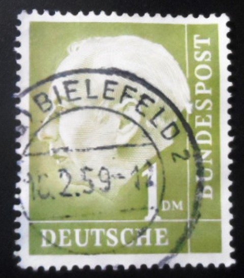 Selo postal Definitivo Circulado Emissão: 01.04.1954 Catálogos: Mi DE 194 -> Usar somente como referência, sem estudo de variedades Medidas: 27,5 x 32,8mm Impressão: Recesso Valor facial: 1 DM