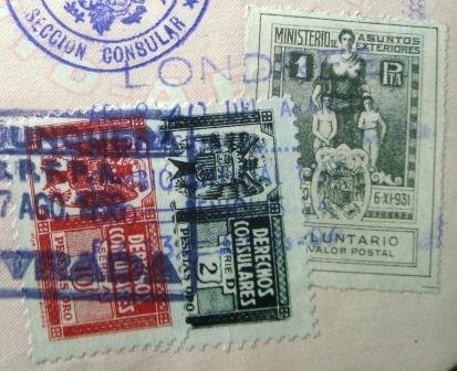 Selos consulares da Espanha afixado em página de passaporte