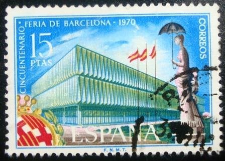 Nota: Edifício de exposições e a estátua da senhora com guarda-chuva, Barcelona