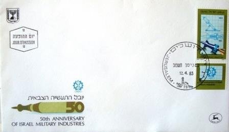 O envelope apresenta selo da série 50th Anniv. of Israel Military Industries, obliterado com Carimbo Comemorativo, e apresenta também Carimbo 1º Dia dde Circulação
