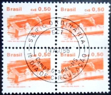 Quadra de selos postais Regulares Não Circulada, com goma, obliterada com Carimbo de 1º Dia de Circulação de CAMPO GRANDE – MS