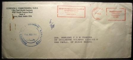Carta circulada entre CARACAS (VENEZUELA) e SÃO PAULO (BRASIL), franqueada mecanicamente.