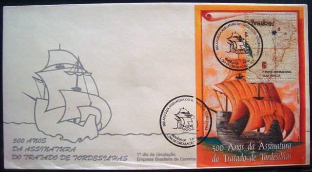 Envelope de 1º dia OFICIAL (FDC) emitido por ocasião dos “500 ANOS DA ASSINATURA DO TRATADO DE TORDESILHAS”,