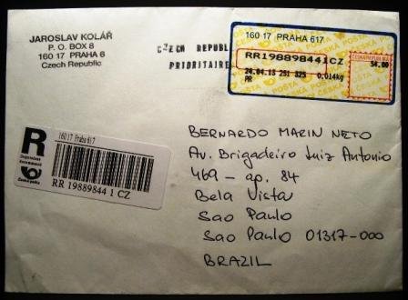 Contém também etiqueta com código de barras do registro e carimbo “CZECH REPUBLIC PRIORITAIRE”.
