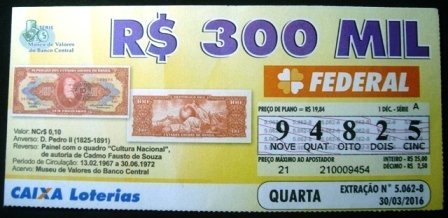 1/20 BILHETE DE LOTERIA FEDERAL, emitido pela Caixa Econômica Federal para a Loteria Federal do Brasil,