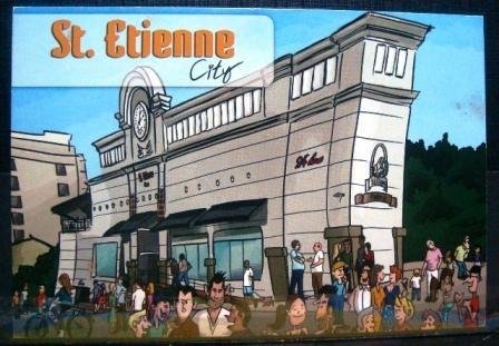No anverso, ilustração (sem crédito) da “St. Etiene City” em forma de desenho animado retratando o edifício e seu público.