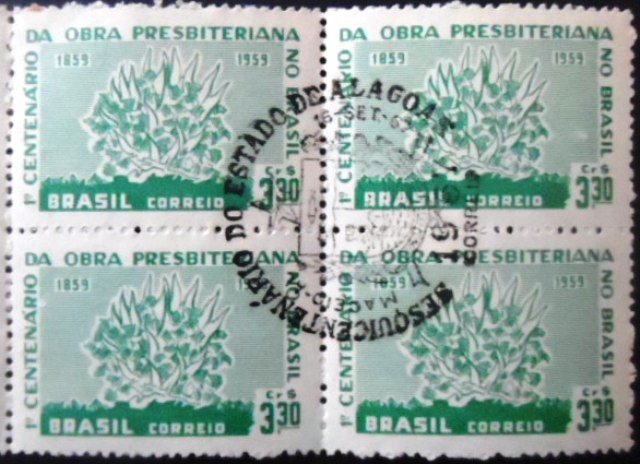 Quadra de selos postais comemorativa, com a goma perfeita, NÃO CIRCULADA, obliterada com carimbo comemorativo de ALAGOAS