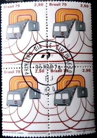 Quadra de selos postais Comemorativos obliterada com Carimbo de 1º de Circulação do Rio de Janeiro – RJ, Não CIrculada