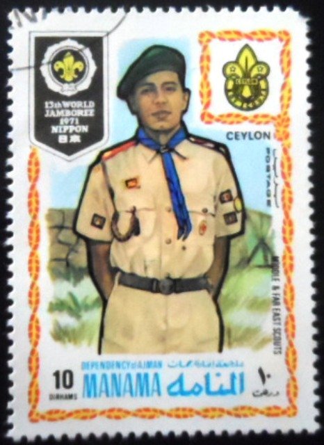Selo postal Comemorativo obliterado NÃO CIRCULADO Emissão: 1971 Catálogos: Mi AJ-MN 470A – Yt AJ-MN 43F Medidas: 32 x 45mm Impressão: Offset Valor facial: 10 Dirham