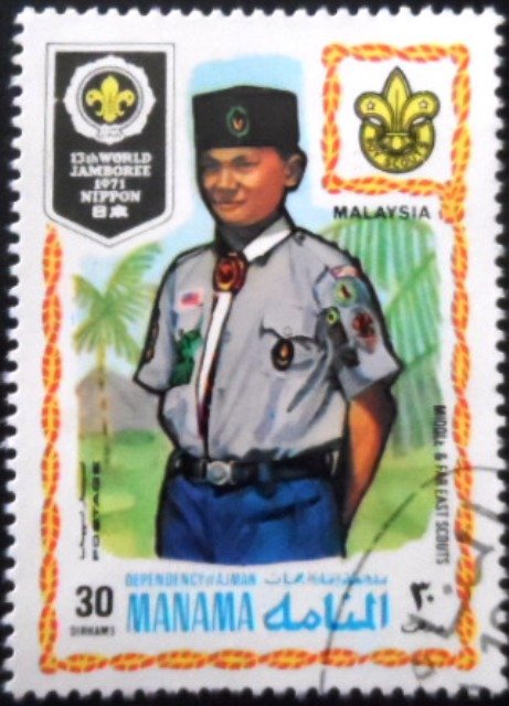Selo postal Comemorativo obliterado NÃO CIRCULADO Emissão: 1971 Catálogos: Mi AJ-MN 475A – Yt AJ-MN 43K Medidas: 32 x 45mm Impressão: Offset Valor facial: 30 Dirham
